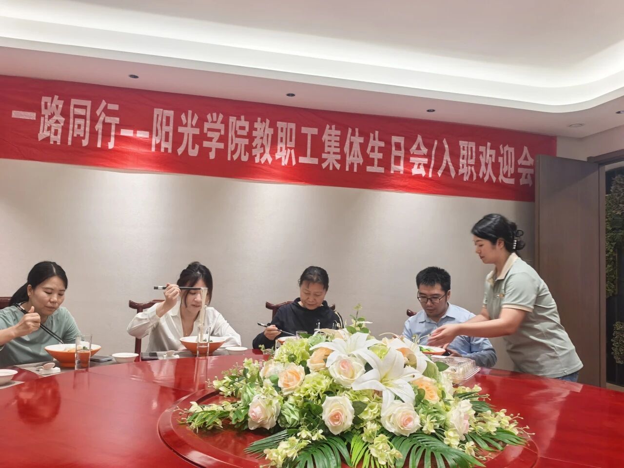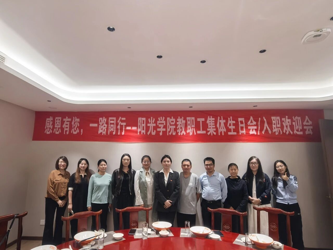 10月31日,由校工会组织发起的“阳光学院教职工10月份生日会/入职欢迎会”在阳光学院东区食堂举行。新老教职工欢聚一室,借生日的喜悦传递关怀,将属于我们的共同美好时光定格。冒着热气的长寿面寓意福寿绵长,透着温润光泽的平安蛋承载美好祈愿,定制生日蛋糕格外吸睛,雅致的布置让整个会场既温馨又热闹。